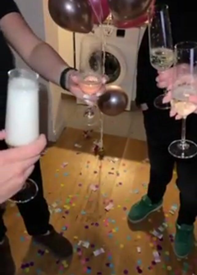 Three people stand in a room decorated with confetti and balloons, raising glasses in a toast. The person on the left holds a glass filled with a white, frothy liquid, while the other two hold glasses of champagne. They clink the glasses together and shout "Ura!" The room has a washing machine in the background, and the floor is covered in colorful confetti and scattered bills. The person on the right wears green sneakers, while the person on the left wears brown shoes. All three individuals are wearing black clothing.