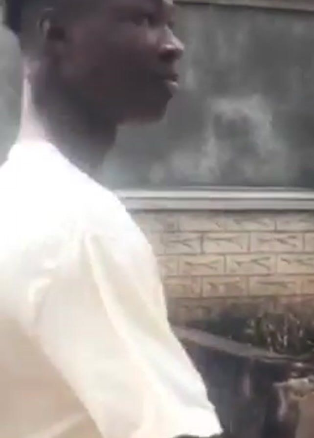 young Black man walking along a paved path. He is wearing a light-colored t-shirt. The surrounding environment includes buildings with painted walls and window frames, landscaping with green bushes and reddish soil, and a palm tree in the background.