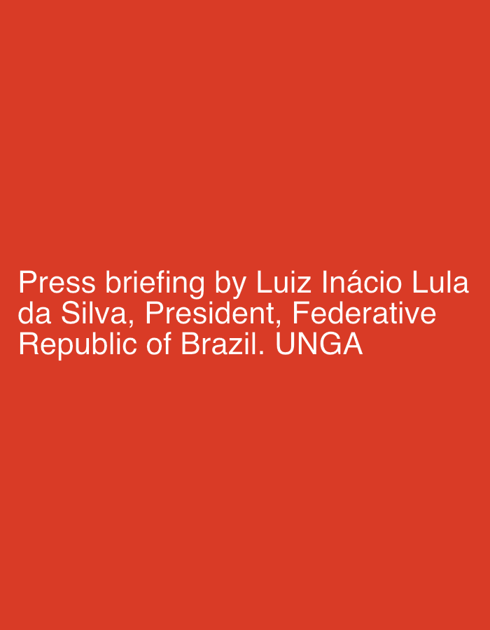 The image displays white sans-serif text centered on a solid, plain red background. The text reads: "Press briefing by Luiz Inácio Lula da Silva, President, Federative Republic of Brazil. UNGA." The environment depicted is a static graphic or digital slide, not a photographic scene. There are no individuals, objects, or actions visually present within the image itself beyond the text on the colored background. The mention of "UNGA" indicates the event is associated with the United Nations General Assembly, which takes place at the United Nations Headquarters in New York City, New York, United States.
