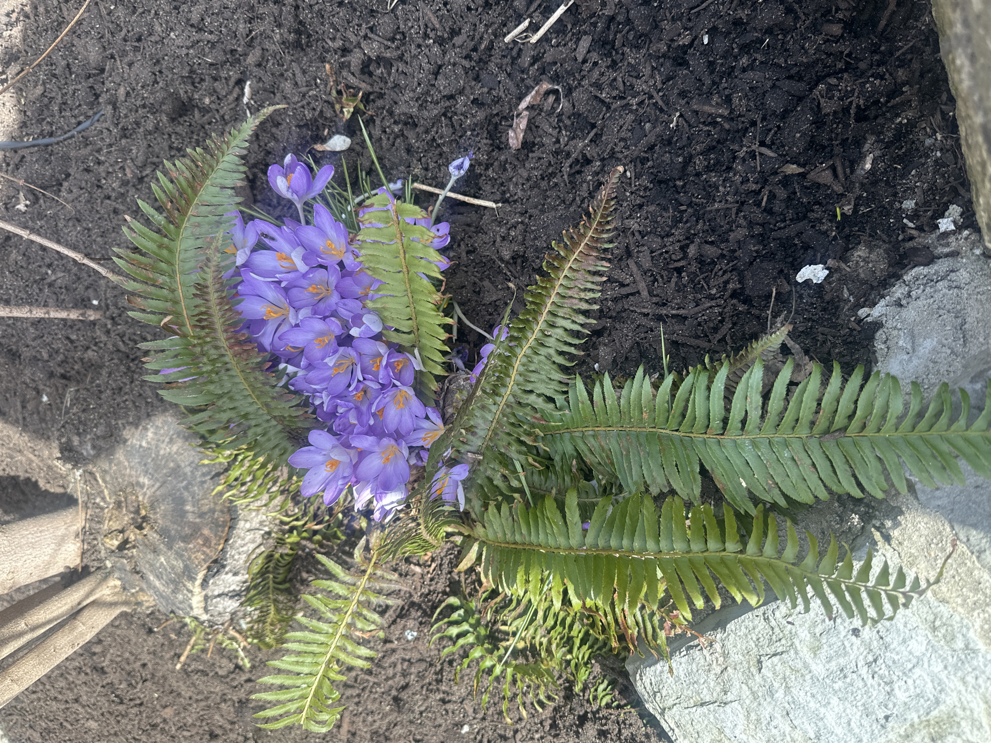 A high-angle shot depicts a small patch of garden soil with a cluster of purple crocuses nestled within the fronds of a fern. The dark soil is moist and freshly turned. The crocuses are in full bloom, displaying their vibrant purple petals and yellow stamens. The fern has long, green fronds that partially cover the crocuses and extend across the garden bed, with some browning on the tips. To the right is a section of rough, grey stone, likely part of a garden border or retaining wall. To the left, is the edge of a cut tree stump. The overall impression is a close-up of spring growth in a garden setting. It is not possible to verify the location in the city of Whistler, Canada, from the provided image.