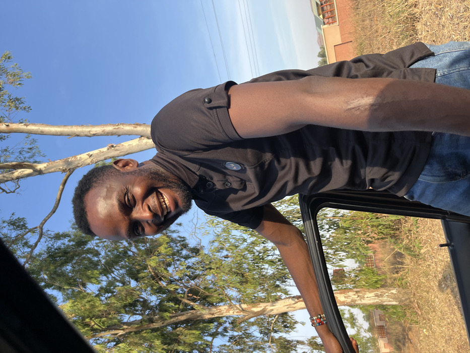 A smiling man in a black collared shirt and jeans leans out of a car window. He is fair skinned with short hair and a beard. A bracelet adorns his wrist. Behind him, trees, dry grass, and a building under a blue sky are visible. A tree branch crosses diagonally in the background. The image is rotated counterclockwise.
