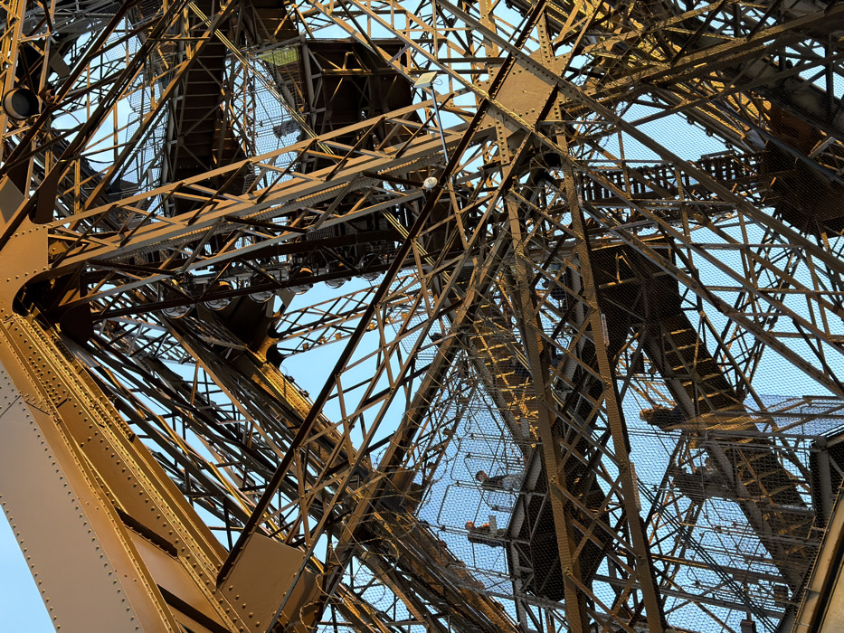 The image presents an upward view into the intricate iron lattice structure of the Eiffel Tower in Paris, France