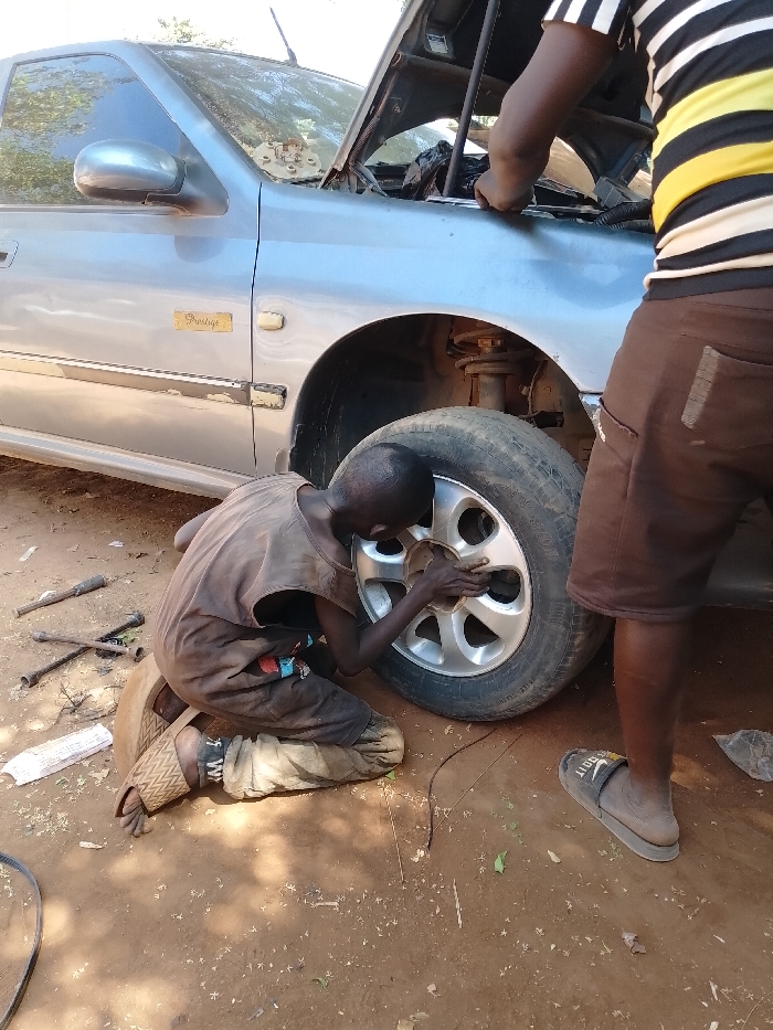An outdoor scene in Yelwa, Nigeria, depicts two individuals engaged in car repair