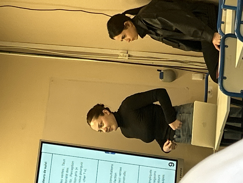 This image depicts an indoor scene within a classroom or presentation room in Strasbourg, France. The environment features pale, light yellow walls and artificial lighting. Two young adult females are visible. The first, on the left, is standing in front of a large digital display or projection screen. She has dark hair styled in a bun, wears a black long-sleeved turtleneck shirt and light blue jeans, and is seen with a slight smile looking slightly off to her left. Her hands are positioned near her waistline. The screen displays French text, including phrases like "ateurs de suivi," "les ventes," "Taux," "Perception," and a prominent "9" at the bottom. A silver Apple MacBook laptop is open on a white desktop surface directly in front of her. The second female, on the right, is seated at a blue-framed desk. She has dark hair tied in a ponytail and is wearing a black collared jacket, possibly leather, over dark clothing. Her profile is visible as she looks towards the left, presumably at the standing woman or the screen. Her left hand rests on the desk surface. Between the two women, on the wall, there is a grey wall-mounted dispenser unit. Vertical utility conduits and a black electrical cable run along the right side of the wall. Several blue-framed desks are partially visible in the foreground.