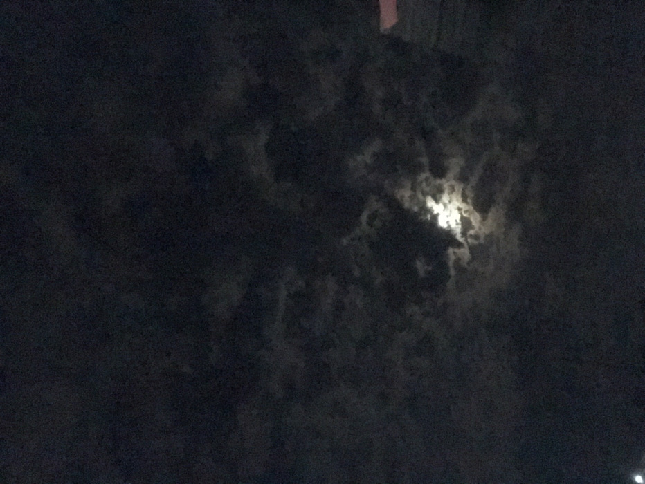 The scene depicts a nocturnal sky observed from Narayi, Nigeria. The majority of the frame is filled with dense, dark grey and black cloud formations. A bright, partially obscured moon is centrally visible through an irregular opening in the clouds, casting a diffuse white light that illuminates the surrounding cloud edges. Faint, unidentifiable artificial light sources are present at the extreme lower-left and upper-right peripheries of the image. No identifiable terrestrial landmarks, individuals, or specific objects are visible within the main celestial view.
