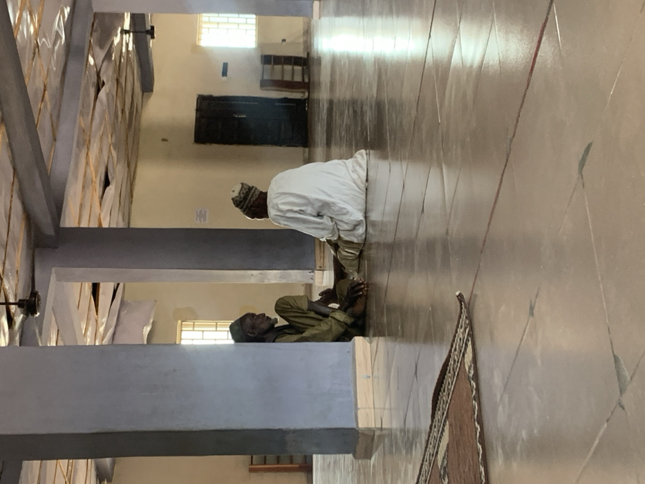 The image depicts an indoor scene in Zango-ndaji, Nigeria, featuring two adult males seated on a light brown tiled floor within what appears to be a communal or religious building