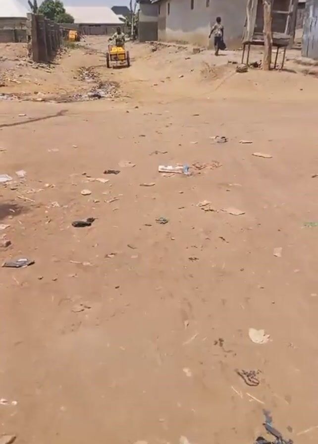dirt road in a village or town. Litter is scattered on the ground. A person is pushing a yellow cart toward the camera. Another person walks in the distance on the same road. Buildings are visible on either side of the road. Wires are suspended above the road.
