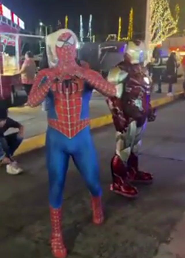 At night, in an outdoor public space decorated for the holidays, a person dressed as Spiderman wearing a white, fur-lined hat dances on the pavement. Beside Spiderman stands a person in an Iron Man costume that has a flashing light in the center of its chest. Other people are visible in the background walking near a red and white food truck and a decorated tree.