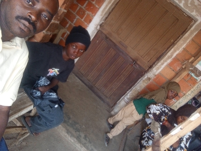 The image depicts four individuals in an indoor or semi-enclosed space in Minna, Nigeria. In the immediate foreground, an adult male with a dark complexion and a mustache is partially visible on the left, wearing a light-colored collared shirt, and appears to be taking a selfie. To his right and slightly behind him, a young person with a dark complexion wears a black beanie, a black t-shirt with a colorful graphic design on the chest, and dark cargo pants. This individual is kneeling on a grey concrete floor, holding a piece of patterned fabric in their lap, and looking towards the camera. Their feet, wearing dark sandals, are visible. In the background, slightly right of center, a closed dark brown wooden door with visible paneling is set within a lighter frame. To the right of this door, a red brick wall is partially exposed, bearing some handwritten text and numbers, including "900 4700". In the mid-ground on the right, another young person, wearing a khaki-colored hooded garment over a green shirt and light-colored trousers, is kneeling or sitting on the concrete floor, also looking towards the camera. Further to the right and partially obscured by a series of rough wooden planks, a fourth individual, wearing a dark patterned garment, is visible. The floor throughout the visible area is grey concrete.