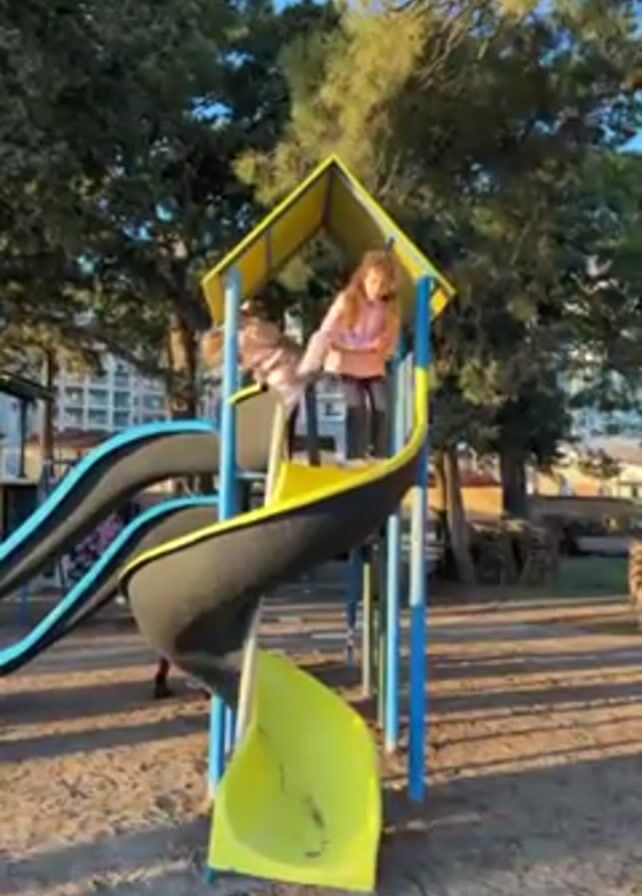 Three children are at the top of a yellow and black spiral slide on a playground. The playground has trees surrounding it, and a tan sandy base underneath it. There's an ocean view visible to the right of the slide. The person recording says "ajde spusti se. jedan dva tri." The children do not slide. The sun is shining.