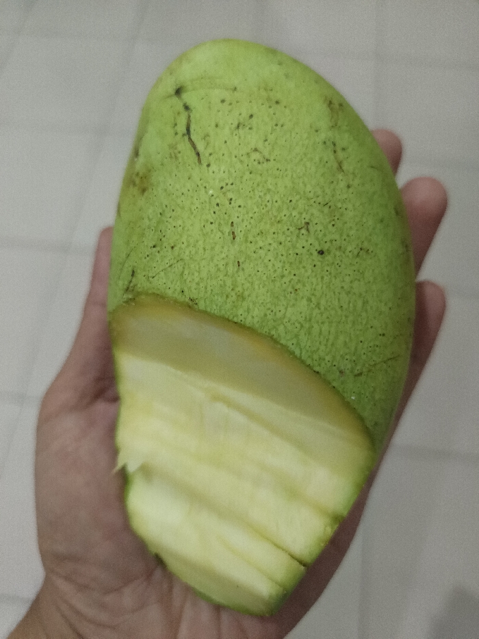 - "A human hand holds a partially sliced green mango against a light-colored, unfocused background, likely indoors within Ouderkerk aan de Amstel, Netherlands" by FM-PvkdH3, licensed under CC BY 4.0
