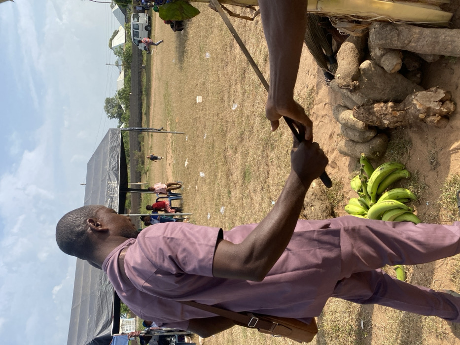 In Itobe, Nigeria, an outdoor scene unfolds under a clear sky. In the foreground, a dark-skinned male subject, seen from behind and slightly to the right, wears a purple short-sleeved top and matching trousers, with a brown messenger bag slung over his left shoulder. His right arm is extended, holding a dark, slender object (possibly a mobile phone or tool) that is being either passed to or received by another dark-skinned right hand, visible from the right edge of the frame. On the ground near the subjects, a cluster of green plantains or unripe bananas rests beside a pile of large, irregularly shaped, light brown yams or similar root vegetables. Partially visible to the far right are a long, thin wooden stick and what appears to be a broom. The ground consists of dry, light brown earth with sparse dead grass and scattered white debris, possibly plastic cups or bags. In the midground, under a black canopy tent, several children are seated on plastic chairs. Further back in the open, dry field, a child is actively running towards the right side of the frame. In the background, a white van is parked, and several low-rise buildings with light-colored roofs are visible against the horizon, partially obscured by a low wall or fence. Scattered trees and utility poles are also present in the distance.