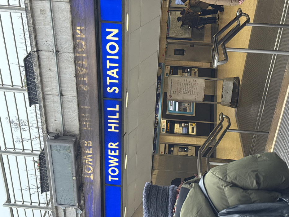 The image displays the entrance to Tower Hill Station in London, United Kingdom