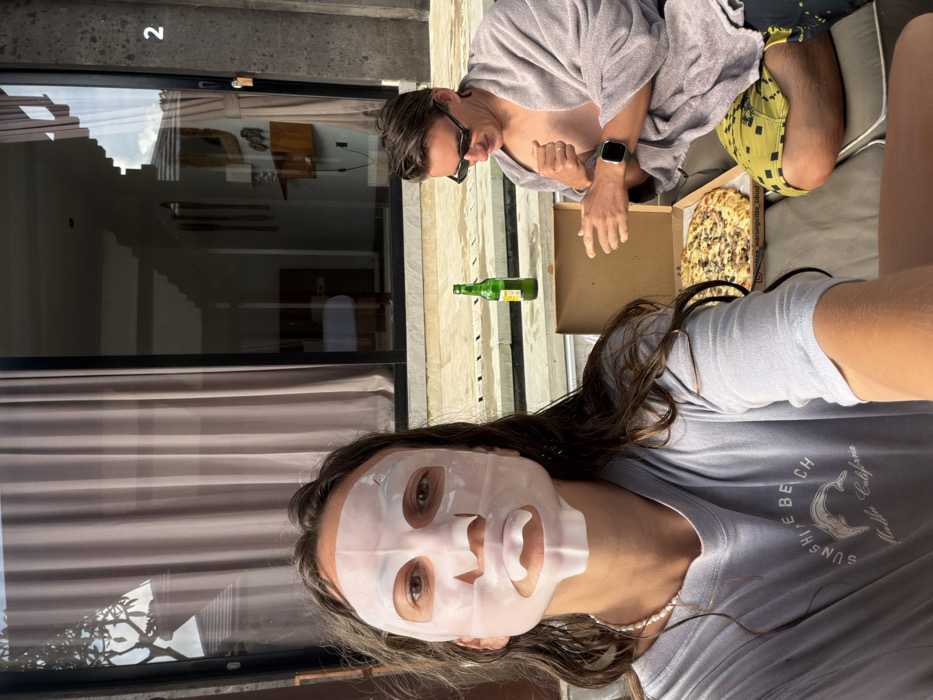Two individuals are depicted in an outdoor leisure setting, likely a villa patio or poolside area, in Mas, Indonesia, under bright daylight conditions. In the foreground and left, a female subject with long brown hair wears a white sheet facial mask, covering her entire face except for her brown eyes. She is wearing a light blue/grey t-shirt with a "SUNSHINE BEACH Malibu California" graphic and a white pearl necklace. Her left arm and shoulder are partially visible as she appears to be capturing a selfie. In the midground and right, a male subject with dark hair and dark sunglasses is seated, partially wrapped in a light grey towel around his upper body. He wears dark and yellow patterned swim shorts and a dark smartwatch on his left wrist. He is looking towards a pizza box, with his right hand extended and fingers slightly curled, as if gesturing or preparing to take a piece. Between the two individuals, on a light-colored outdoor cushion, rests an open cardboard pizza box containing a large pizza topped with mushrooms and another ingredient resembling ham or bacon. A label within the box reads "PIZZA_WARUNGGINTA_UBUD." Behind the pizza, on a light-colored ledge, a green glass bottle with a yellow label stands upright. The background features large glass sliding doors with dark brown curtains drawn behind them, reflecting trees and the sky. To the right of the doors, a dark grey textured wall displays the number "2." The ground consists of light-colored paving stones, and a water feature or pool edge with a drainage grate is visible behind the ledge. The two subjects appear to be relaxing and eating outdoors.