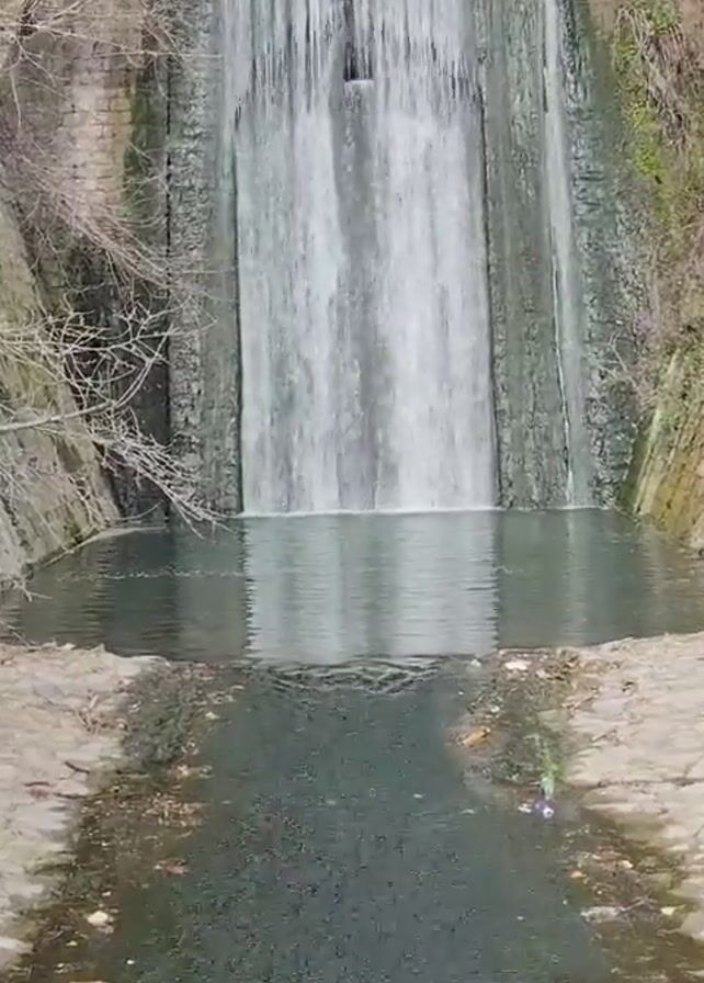 waterfall cascading over a stone wall into a pool of water. The waterfall is wide and evenly distributed, creating a curtain of water. The stone wall appears to be old and is flanked by vegetation on either side. The pool at the base of the waterfall is relatively calm, with ripples visible on the surface. There is some debris and leaves floating in the pool. The water further downstream appears shallow and slightly murky. The weather seems overcast.