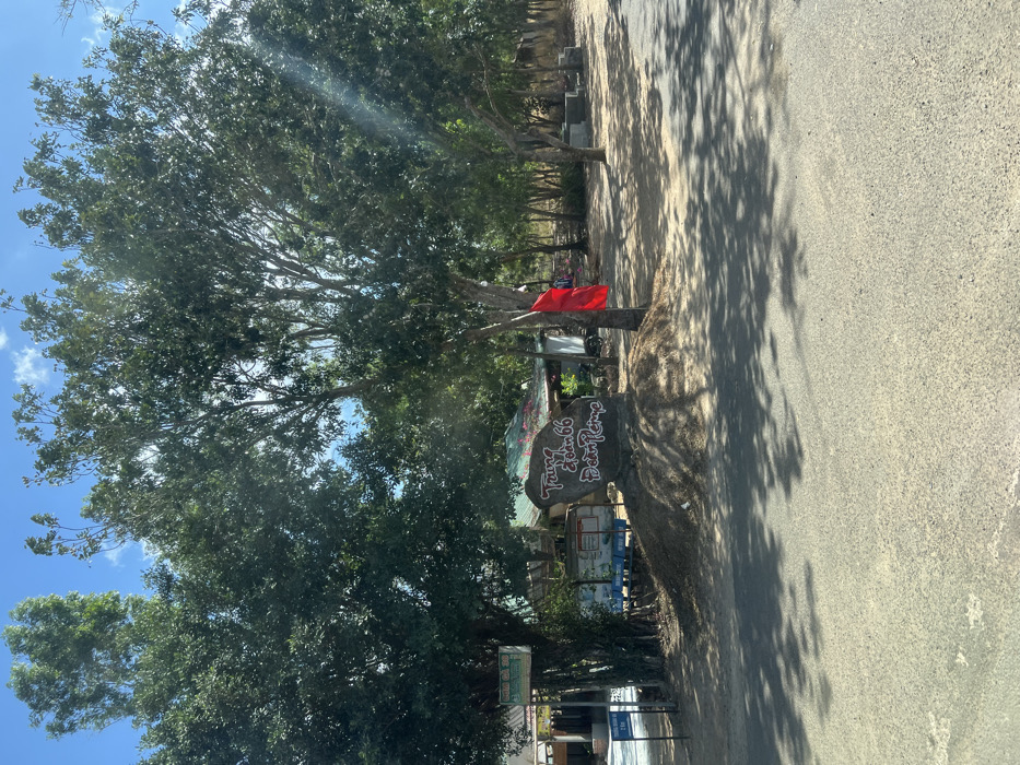 A street with a stone sign reading "Trung Tram 96 Beach Camp"