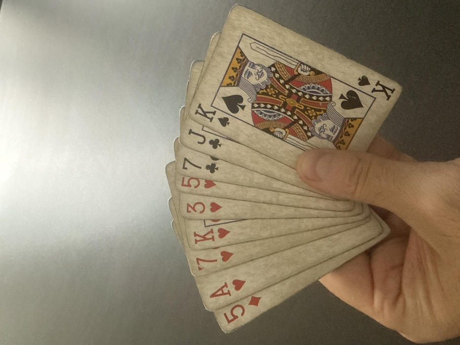 - "A human hand is prominently positioned in the lower right foreground, holding a fan of approximately nine playing cards" by FM-H0rwJ2, licensed under CC BY 4.0