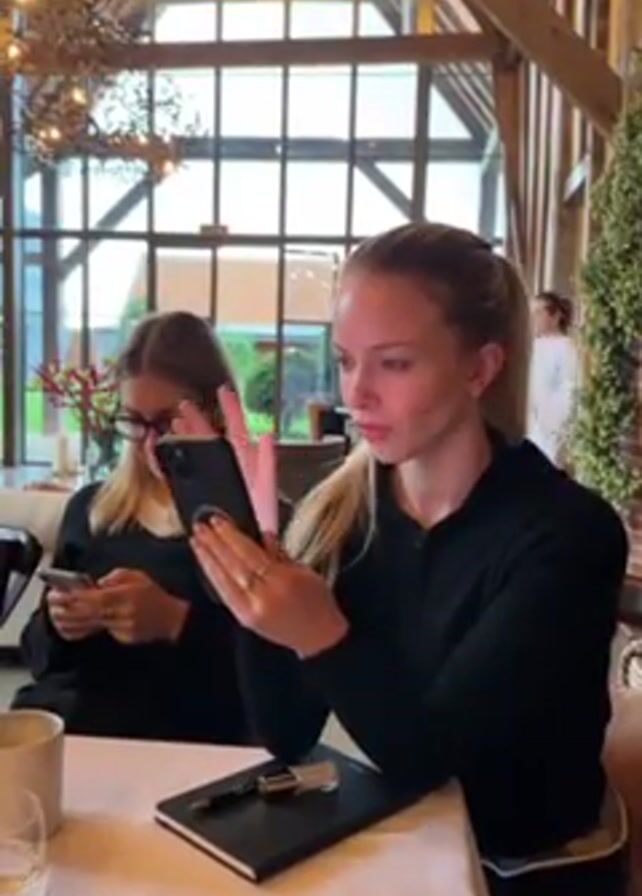 Two women are sitting at a table in a room with a high, angled ceiling with wooden beams. The woman in the foreground has blonde hair pulled back in a ponytail and is wearing a black shirt. She is holding a black smartphone in her hand and appears to be on a call, looking directly at the camera with a surprised expression. The other woman has brown hair and is wearing glasses and a black shirt. She is looking down at her smartphone. There is a black notebook, a pen, and a clear glass of water on the table. Behind the women, there is a large window with a view of a grassy area and a building. Another woman, wearing a white shirt, walks behind the subject on the phone.