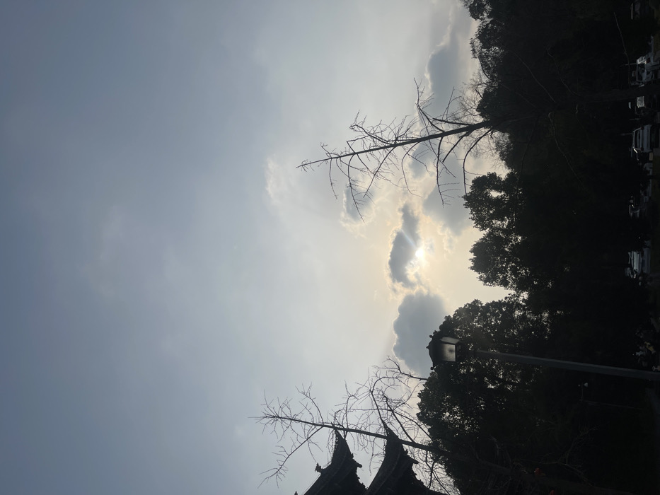 The image presents an outdoor scene in Bishan, China, observed during sunrise or sunset, characterized by significant backlighting. The upper two-thirds of the frame consist of a hazy, light blue-grey sky with scattered, diffuse clouds. The sun is visible slightly right of the frame's center, partially obscured by a cloud, emitting a soft, yellowish glow. In the lower left portion of the image, the dark silhouette of a multi-tiered, traditional Chinese architectural structure, resembling a pagoda or temple roof with curved eaves, is visible. Two prominent leafless deciduous trees with stark branches stand against the sky; one is positioned near the architectural structure on the left, and a taller, more central one is slightly to the right of the sun. A dark, traditional-style streetlight with a lantern fixture is centrally located below the sun, to the left of the taller bare tree. A dense, dark mass of evergreen trees forms a continuous line across the midground. Below the trees, a ground area functions as a parking lot, where multiple vehicles, primarily light-colored cars, are parked. Several indistinct human figures are visible within the parking area, concentrated towards the left-center, their actions not clearly discernible due to distance and lighting conditions. The overall environment suggests a park or cultural site in the city.