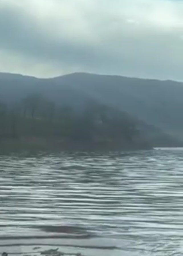 view of a lake with mountains in the background. The sky is partly cloudy, with some areas of blue. The water has small ripples and is reflecting the sky. There is some debris near the foreground of the lake.