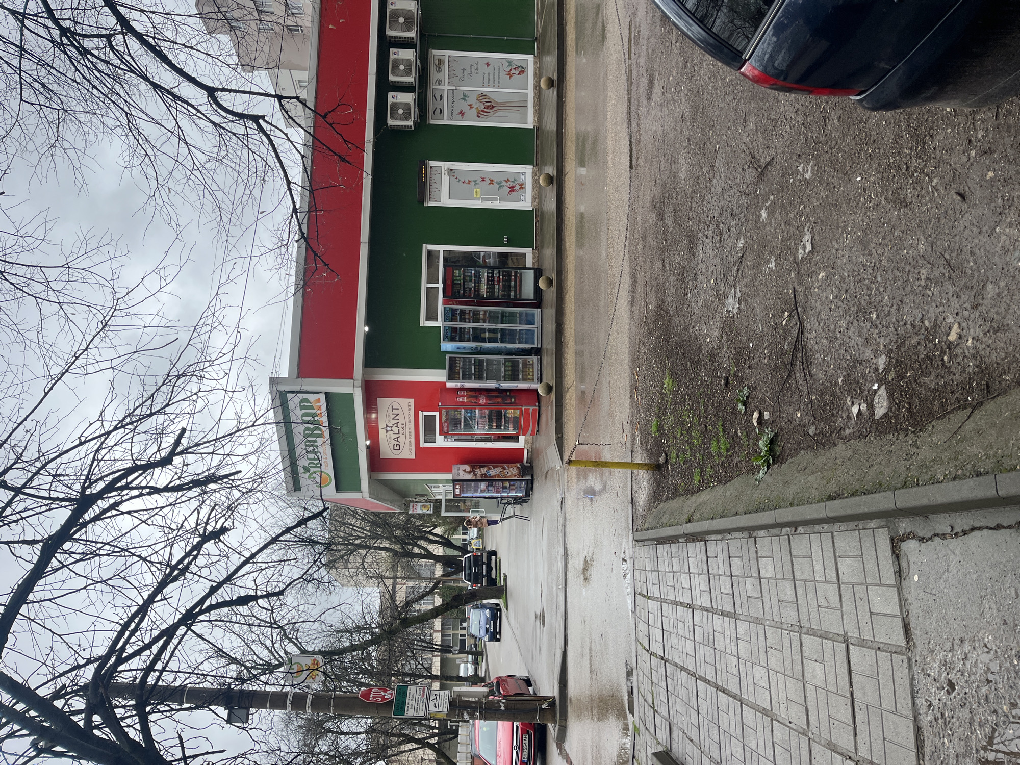 street scene in Montana, Bulgaria. The view is angled and includes a sidewalk made of rectangular gray pavers. Adjacent to the sidewalk is a wet street with parked cars. A building with red and green exterior walls is visible, featuring signage for "Bistro" and "Galant" (a candy shop offering coffee and frozen sweets). Various refrigerators and drink coolers are located outside the "Galant" shop. Bare trees are present on the left side of the image, and utility poles and signs are also visible. A black car is partially visible at the top right of the image.