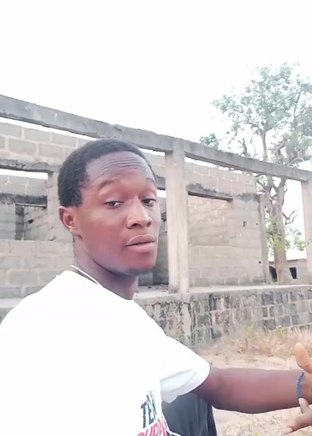 A person with short, dark hair is in a selfie view. They are wearing a white t-shirt and a necklace. Their expression is serious as they point at the camera and then make a "one" gesture with their finger. They are standing outdoors in front of a building that is under construction. The building has concrete blocks and a partial roof. A tree is visible in the background. The ground appears to be dry and grassy.