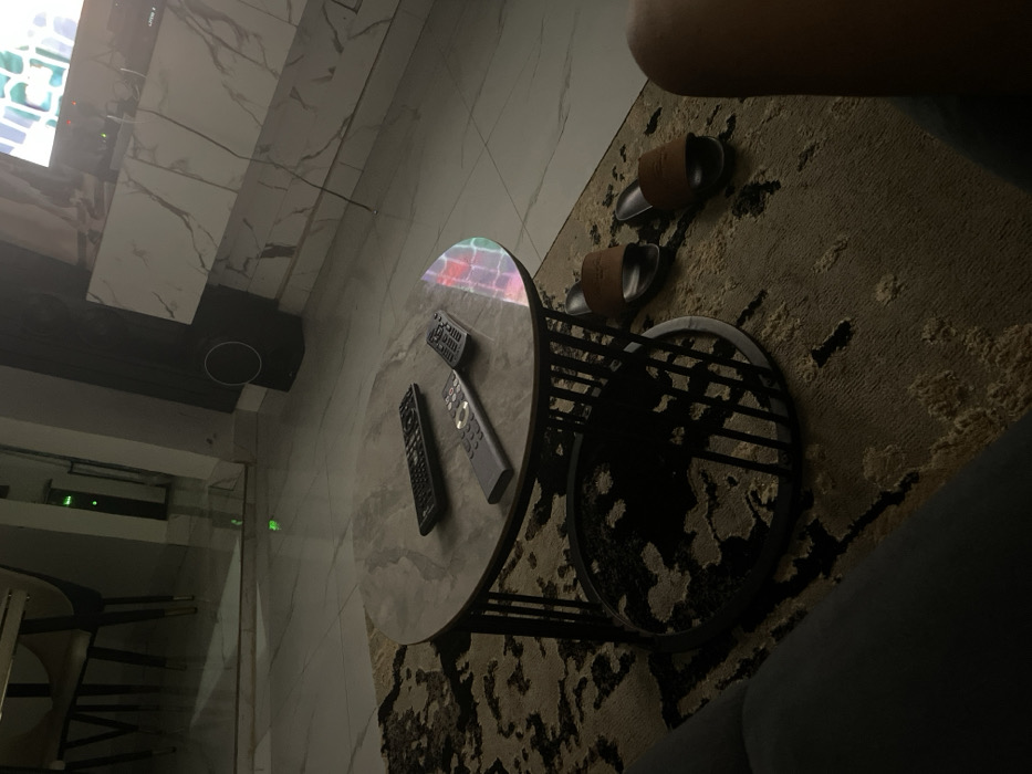 The image displays an indoor residential living space located in Okpanam, Nigeria, captured from a low perspective, likely from a seated position on a sofa. In the immediate foreground, a dark grey sofa arm or cushion is visible on the left, and a human leg, bare from the knee down, is present on the right, indicating a seated individual. A patterned area rug, with abstract designs in shades of beige, brown, and black, lies over reflective white tiled flooring. A pair of brown leather slide sandals are placed on the rug to the right of a coffee table. The central subject is a circular coffee table with a light grey marble-patterned top and a black metal, cage-style base. Three remote controls are arranged on its surface: one black, one silver-grey, and one smaller black unit. The tabletop reflects multicolored light, originating from an off-screen source. In the mid-background, a modern entertainment console with a white, veined marble-like finish is positioned against a wall. A dark, cylindrical speaker or subwoofer stands next to the console. Above the console, a television screen is partially visible, displaying abstract, vibrant, geometric patterns. To the left in the deeper background, a dining area with a table and chairs is partially visible. A small, distinct green light is observable on a vertical surface further in the background, possibly an indicator light on an electronic device or in an adjacent hallway. The overall lighting conditions are dim, suggesting evening or nighttime. The scene is static, with no active individuals or explicit actions beyond the implied presence of one person.