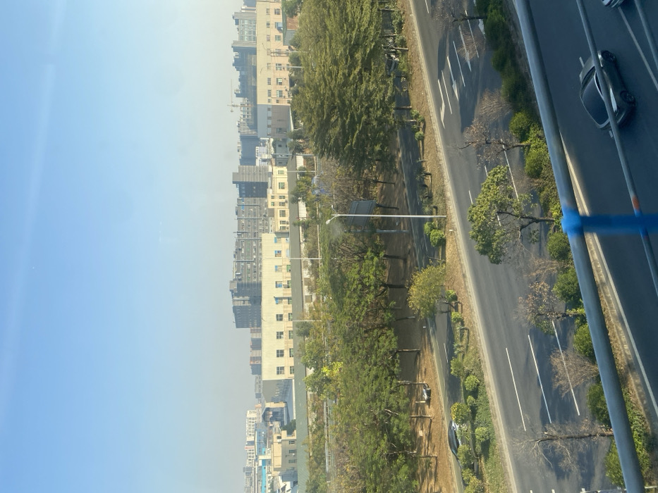 The image depicts an elevated view of an urban-industrial landscape within Shunde District, China, under a clear, hazy blue sky. In the foreground, a grey metal railing with a blue segment is visible. Directly beyond the railing, a multi-lane asphalt road traverses the scene horizontally, marked with solid and broken white lines, including white directional arrows in the right lanes. Two cars are present in the lower right lane: a dark-colored vehicle with a prominent curved roofline and, partially visible behind it, a light-colored vehicle. On a grassy median strip to the far left of the road, a dark-colored sedan is parked facing left. The road is bordered by landscaped areas featuring numerous trees, predominantly with green foliage, and various shrubs. Some smaller trees or shrubs appear bare. A grey street light pole with an attached sign stands among the trees on the right side of the road. The background is populated with a mix of industrial and commercial buildings. Lighter-colored, multi-windowed structures, likely factories or warehouses, are visible on the left and center. Further to the right and in the distance, larger, multi-story grey industrial buildings dominate the skyline, with a construction crane faintly visible on the far right horizon. No individuals are discernible in the scene.