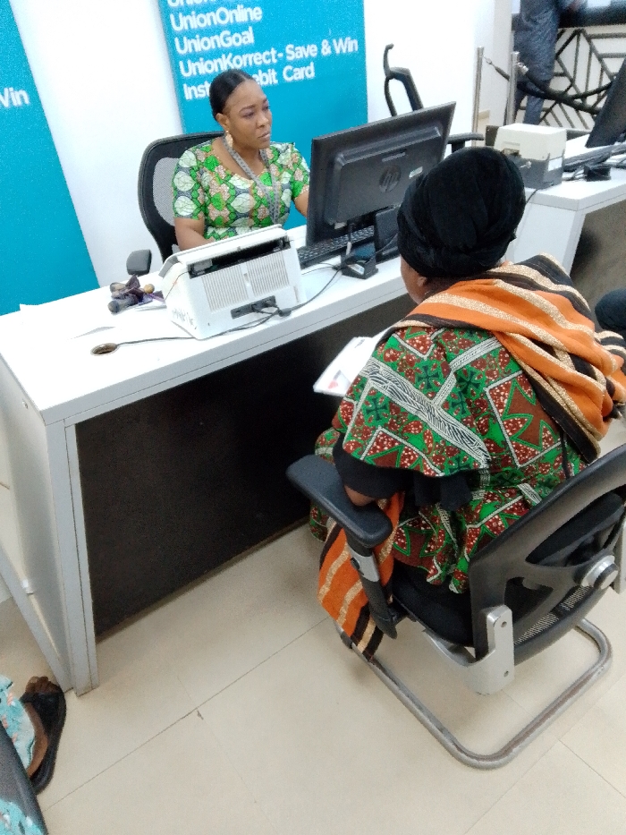 In a bank, a customer wearing a colorful traditional outfit and head covering sits across a desk from a bank teller