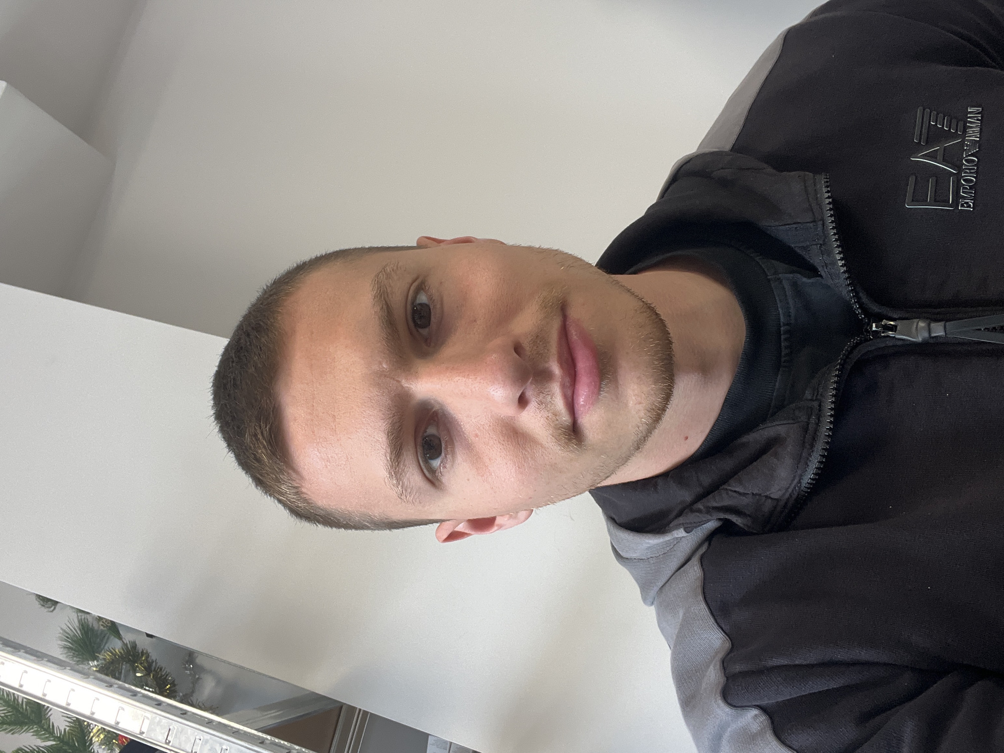 A frontal portrait shot of a male individual is presented. The man has short, light brown hair and light stubble on his chin and upper lip. He possesses brown eyes and directly faces the camera. He is wearing a black zippered hoodie with grey accents on the shoulders and hood. A black t-shirt is visible beneath the hoodie. The right chest area of the hoodie (viewer's left) displays the "EA7 EMPORIO ARMANI" logo. The background consists primarily of a plain, light-colored wall. In the upper left corner, a portion of a metallic structure, possibly a ladder or shelving unit, is visible, adorned with green foliage and small gold-colored decorations, suggesting an indoor setting. There are no specific identifying features within the image to determine a precise location within the city of Burgas, Bulgaria. No explicit actions or interactions beyond posing for the photograph are depicted.