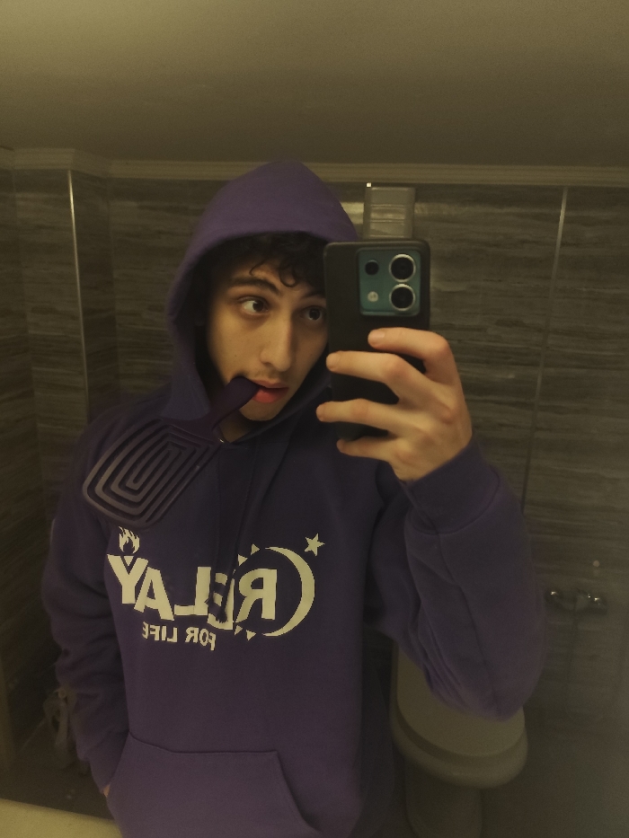 - "A young person with dark curly hair wearing a purple hooded sweatshirt takes a selfie in a bathroom" by FM-BskwX2, licensed under CC BY 4.0