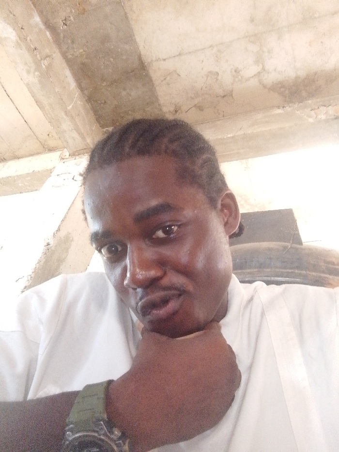 A dark-skinned male subject is depicted in a close-up, chest-up shot