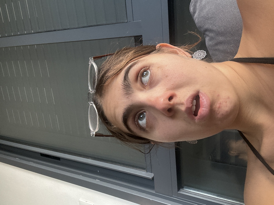 A close-up, high-angle portrait shows a female subject with light skin and brown hair, looking upwards and slightly left with a surprised or bewildered expression, mouth slightly agape. She has clear-framed eyeglasses resting on top of her head and wears silver-colored, circular, filigree-style dangle earrings, along with a dark-colored spaghetti strap top. Her lower face exhibits minor skin blemishes. The background features a dark grey window frame with horizontal blinds, suggesting an interior view of a residential building in Givatayim, Israel. A faint reflection of another individual is visible in the lower left portion of the window glass. A grey upholstered cushion or pillow is partially visible to the subject's right.