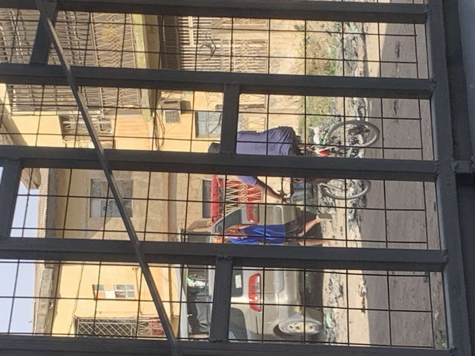 The image depicts a street scene in Sabon Gari East, Nigeria, viewed through a dark grey metal grid fence. In the foreground, the fence's square grid pattern and vertical/horizontal bars obscure parts of the scene. The environment consists of several two-story buildings in the background, primarily light yellow or beige in color, showing signs of wear and weathering. Many windows are fitted with metal security bars. One building features a corrugated metal roof, while another displays an exterior air conditioning unit and a balcony with ornate railings. The ground, visible between the foreground fence and the background buildings, appears to be an unpaved or dirt road, uneven and strewn with minor debris and sparse vegetation. Two individuals are visible. On the right, a person is riding a bicycle, seen from the rear. This individual wears a purple short-sleeved top and dark bottoms. The bicycle has a white frame with red accents and appears to have a white item, possibly a bag or fabric, attached near the rear wheel or seat post. To the left of the cyclist, slightly further back and partially obscured by the foreground fence and a parked vehicle, a second individual is walking. This pedestrian, also seen from the rear, wears a blue long-sleeved shirt and dark shorts, with flip-flops on their feet. A light-colored minivan, consistent with a beige or gold Toyota Sienna, is either parked or slowly moving on the left side of the frame, its rear visible. The sky overhead is clear and bright. Both individuals appear to be moving from left to right across the frame.
