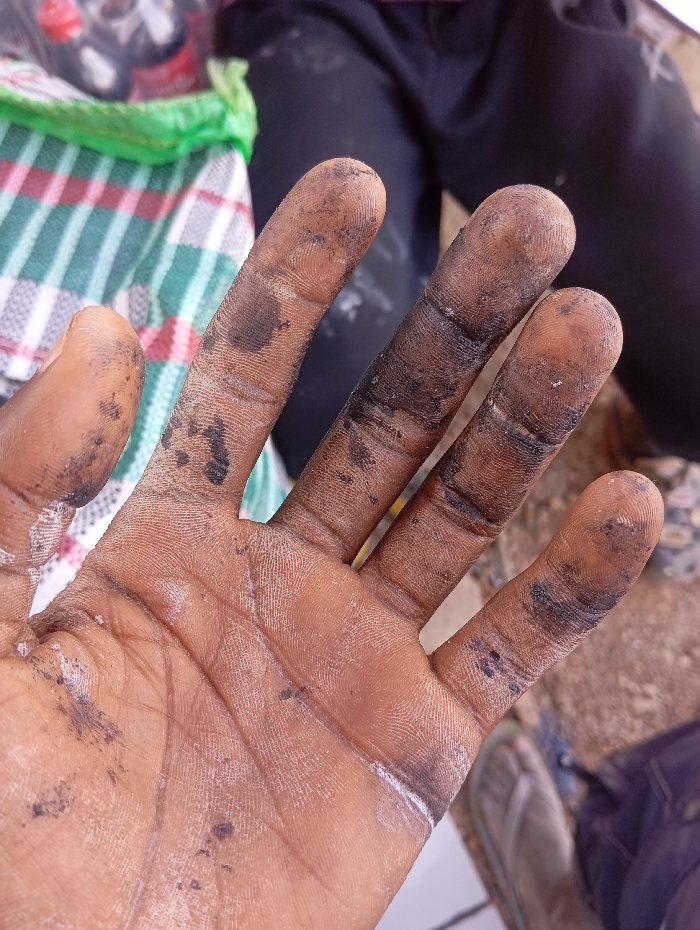 The scene is located in the city of Reifild-Ist, Nigeria. The image presents a close-up view of a human left hand, palm facing upwards, heavily soiled with dark, granular matter. The skin exhibits a dark complexion. Dark particulate residue is concentrated on the fingertips and within the creases of all five fingers. The palm also displays smudges of this dark substance, alongside lighter, whitish residue present in the palm lines and on the general palmar surface. In the upper left background, a section of green, white, and red plaid fabric is visible. Behind this fabric, a blurred object containing red components is discernible. The upper right background shows the knee or thigh area of an individual wearing dark-colored trousers. The lower right background reveals a foot clad in a light-colored sandal or flip-flop, resting on a reddish-brown, dusty ground surface. The state of the hand indicates recent contact with a dirty material or environment.