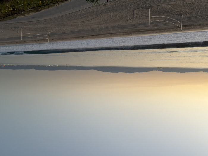 An outdoor scene depicts a beach with light sand and vegetation in the top left. Two volleyball nets stand on the sand. The ocean's edge is visible with a white wave line. Across the water, a distant mountain range is illuminated by city lights. The sky transitions from a light blue at the bottom to a warm, yellowish glow near the horizon, indicating either sunrise or sunset.