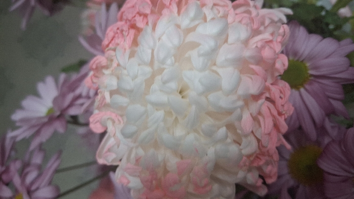 The image showcases a collection of flowers in a close-up shot. A large, spherical flower dominates the center, featuring dense, layered petals that transition from white at the center to a soft pink at the edges. Surrounding this centerpiece are smaller, daisy-like flowers with lilac-colored petals and yellow centers. These flowers are less densely packed, offering a contrast in texture and color. The overall composition is soft and visually appealing, creating a vibrant and detailed floral arrangement.