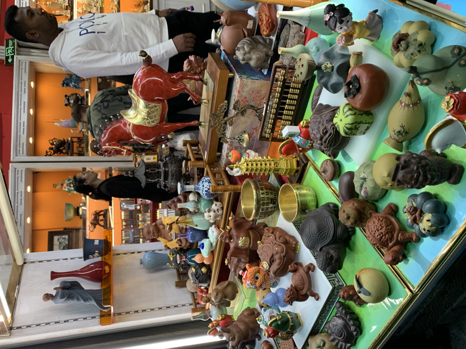 The image displays an indoor market stall or shop in Shangcheng District, China, packed with an extensive collection of decorative items