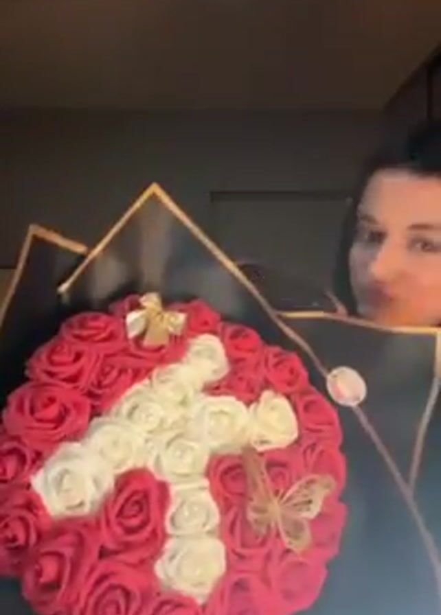 A woman holds a round bouquet of red and white artificial roses, arranged to form the letter "T". The bouquet is wrapped in black paper with gold accents and features a gold butterfly. The woman smiles at the camera and then turns slightly to the side. The background is dark and dimly lit.