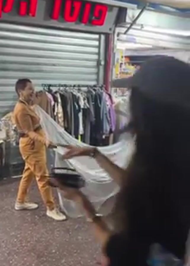 A woman in a wedding dress is standing in a market while another woman holds the veil. The woman in the wedding dress is holding a bouquet and has a veil on her head. She is standing in front of a store with clothes and other merchandise. The other woman is wearing an orange outfit and is holding the veil as the bride walks. The market is crowded with people and stalls selling various items. The camera person follows them from behind.