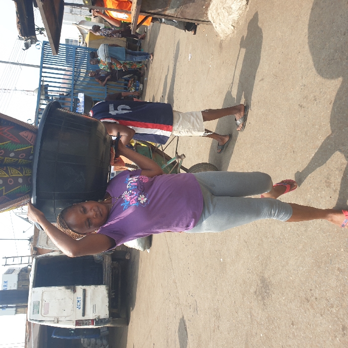 The image portrays an outdoor market scene in Onitsha, Nigeria, under bright daylight. In the foreground, a woman, appearing to be in her 30s or 40s, with dark skin and short dark hair, walks towards the left of the frame. She carries a large, dark-colored plastic basin on her head, topped with several colorful, patterned woven items. Her right hand is raised, steadying the load. She wears a purple short-sleeved t-shirt with a floral design on the chest, light grey capri-length leggings, and red flip-flops. Her expression is focused, directed slightly downwards. Immediately behind the woman, a man, partially visible, wears a blue, red, and white sleeveless jersey with the number "15" on the back, light-colored shorts, and dark slide sandals. He is positioned near a partially visible green two-wheeled handcart, suggesting he is pushing it. In the left background, a white commercial van with its rear doors open is parked. The letters "JCMT" are visible on its back door, and a partial sign reading "REMARK" is above it. A ladder is secured to the van's roof. Further back on the right, a blue metal gate or fence structure is visible. Several other individuals are present in the midground and background, some standing, some walking. One man in an orange t-shirt is partially visible on the far right, adjacent to a wooden stall structure. The ground consists of light-colored, uneven dirt or concrete, with prominent shadows cast by the subjects, indicating strong overhead sunlight.