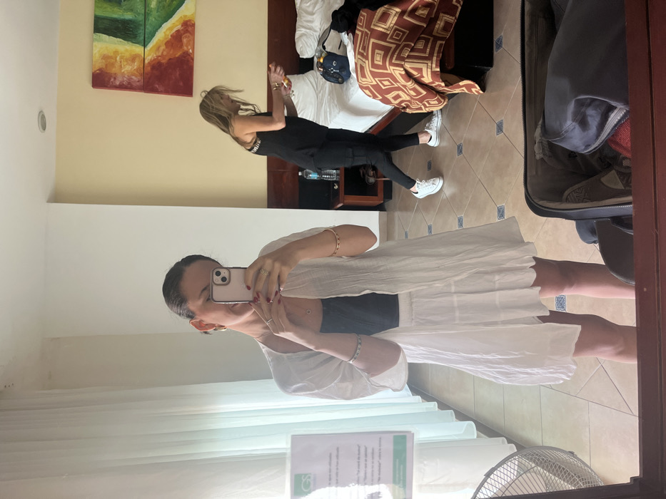 The image displays an indoor scene within a hotel room in Chamilpa, Mexico. A female subject with dark hair pulled back, wearing gold hoop earrings, rings on both hands, a silver bracelet, a gold-toned bracelet, a black tank top, a white layered skirt, and a white sheer long-sleeved cover-up, is positioned centrally, taking a mirror selfie with a light-colored smartphone. In the background, to the right, a second female subject with long blonde hair, dressed in a black sleeveless top, black cargo pants, and white Converse-style sneakers, stands next to a bed. She is holding an orange bottle or container in her right hand. The room features light yellow-cream painted upper walls transitioning to white lower walls, and light brown square floor tiles with darker grout. The bed has a dark brown wooden headboard, white linens, and a brown and orange geometric patterned blanket or throw. A blue bag is also on the bed. A dark brown wooden nightstand sits beside the bed, holding a clear water bottle. Above the bed, a two-part abstract painting displays shades of red, orange, yellow, and green. On the left side of the room, white sheer curtains cover a window. A white portable fan with a circular grille is visible on the floor near the mirror, alongside a white sign with green text, possibly a hotel notice. An open black suitcase with inner compartments and contents is positioned in the immediate foreground, at the bottom of the mirror frame.