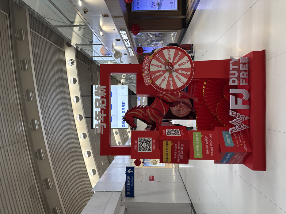 The image depicts an indoor commercial space, likely a terminal or concourse at Beijing Capital International Airport in Chaoyang District, China. A prominent red and white promotional display for "WFJ DUTY FREE" stands centrally on a light-colored tiled floor. The display features a stylized red cutout of a horse in a rearing posture, positioned within a large red rectangular frame. Above this frame, a black digital screen shows Chinese characters including "马年启新" (New Beginnings in the Year of the Horse) and "云端上 品质随行" (On the cloud, quality travels with you). To the right of the horse, a circular red and white "spin-the-wheel" game board, adorned with Chinese text indicating potential prizes, is affixed to the display. To the left, several red boxes are stacked vertically, showcasing multiple QR codes and Chinese text advertising promotions, such as "即刻扫码" (Scan Immediately), "马年送喜 100%中奖" (Year of the Horse brings joy, 100% winning), "新春好礼" (New Year gift), "香化品类 低至6折" (Cosmetics up to 40% off), and "酒水食品 低至8.5折" (Alcohol and food up to 15% off). The base of the display is red, decorated with red fan-shaped elements, and bears the silver lettering "WFJ DUTY FREE". The environment features a high, corrugated ceiling with evenly spaced circular light fixtures. To the left of the display, a light grey wall structure includes a blue sign with an upward arrow pointing to "离境退税代理" (Tax Refund). To the right, a commercial corridor extends with multiple retail storefronts visible through glass, displaying various products and signage, including faint "GUCCI" branding and "DRINK LIQUOR". Red spherical lanterns hang from the ceiling in this corridor. Several blurry, indistinct figures are visible in the background, moving through the space, but no specific actions or interactions are discernible. The area is brightly illuminated by artificial lighting.