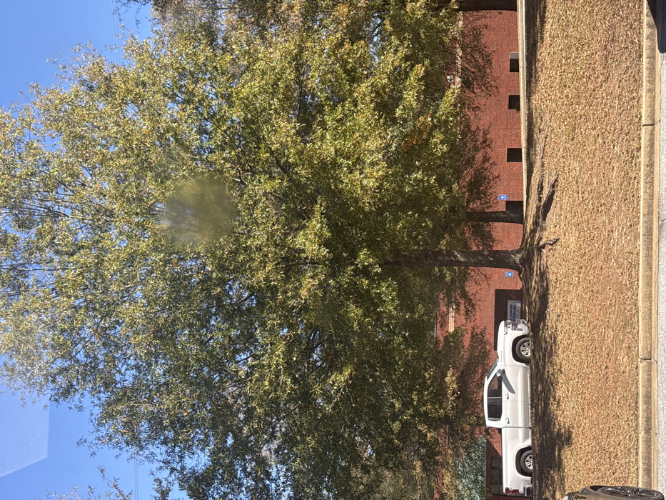 A large green tree dominates the scene, its branches extending across the frame. A red brick building is visible behind the tree. A white pickup truck is parked near the building. The ground is covered in dry grass and leaves. A clear blue sky peeks through the tree branches. The image is taken at an angle, making the scene appear tilted.