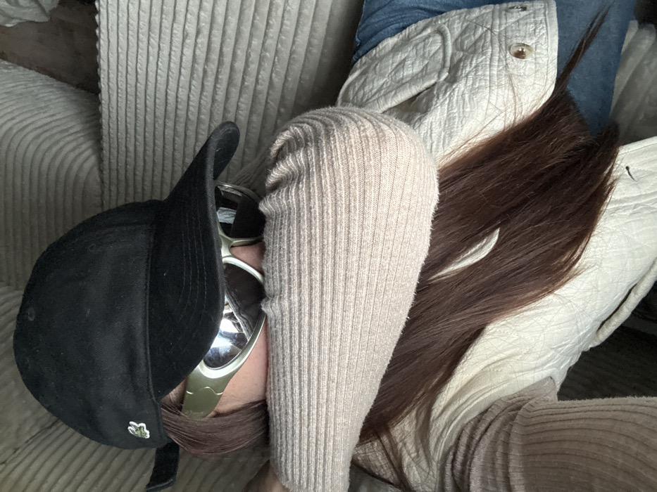 An individual is depicted reclining indoors on an upholstered surface, likely a sofa, in Wattrelos, France. The subject wears a black baseball cap with a green Lacoste crocodile logo, pulled low over the forehead, and light green-framed, mirrored sunglasses that obscure the eyes. Long, straight, dark brown hair is visible beneath the cap and extending below the right arm. The individual is dressed in a light beige, ribbed, long-sleeved top, with the right forearm bent and covering the lower portion of the face. Over the top, a light-colored, possibly cream or off-white, quilted vest with light-colored buttons is worn, partially covering a blue garment, possibly jeans or a denim top. The background consists of a light-colored, horizontally ribbed fabric consistent with upholstery.
