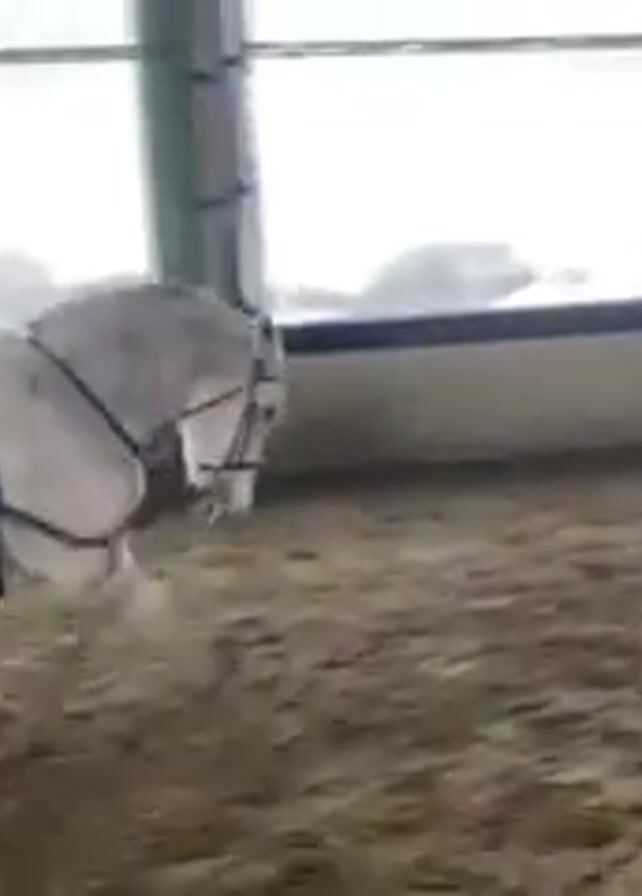 Inside a large indoor riding arena, a white-and-brown horse wearing a bridle and a black harness is trotting. The arena has a sand floor and is well-lit by overhead lights and windows on the far wall. The horse is connected to a purple training lead, held by someone unseen. The camera follows the horse as it moves around the arena.