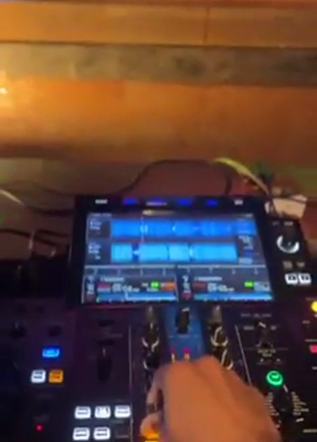 DJ manipulating a mixer, with a crowd visible behind the DJ booth