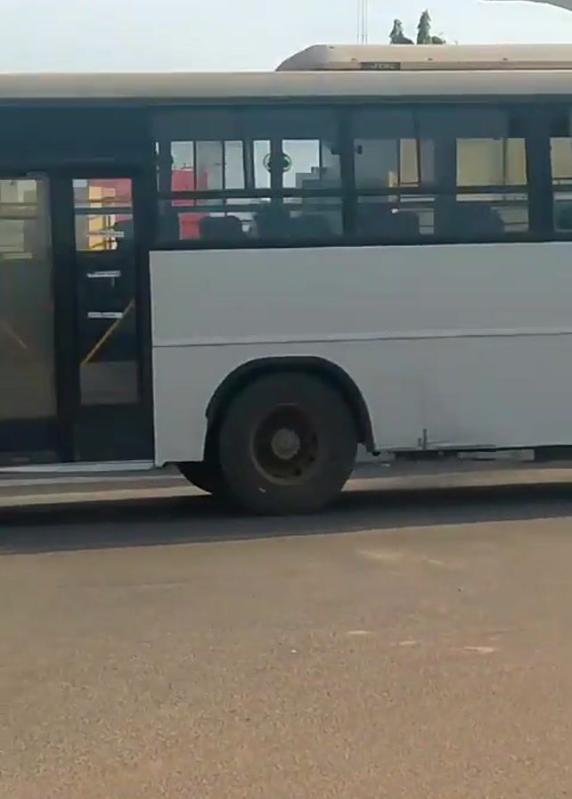 white bus driving past on a paved road. A motorcycle with three passengers then passes by. A silver car drives by in the opposite direction. The video ends with a close up of someone’s arm in a light colored shirt. The setting seems to be an urban environment, with buildings and signs visible in the background.