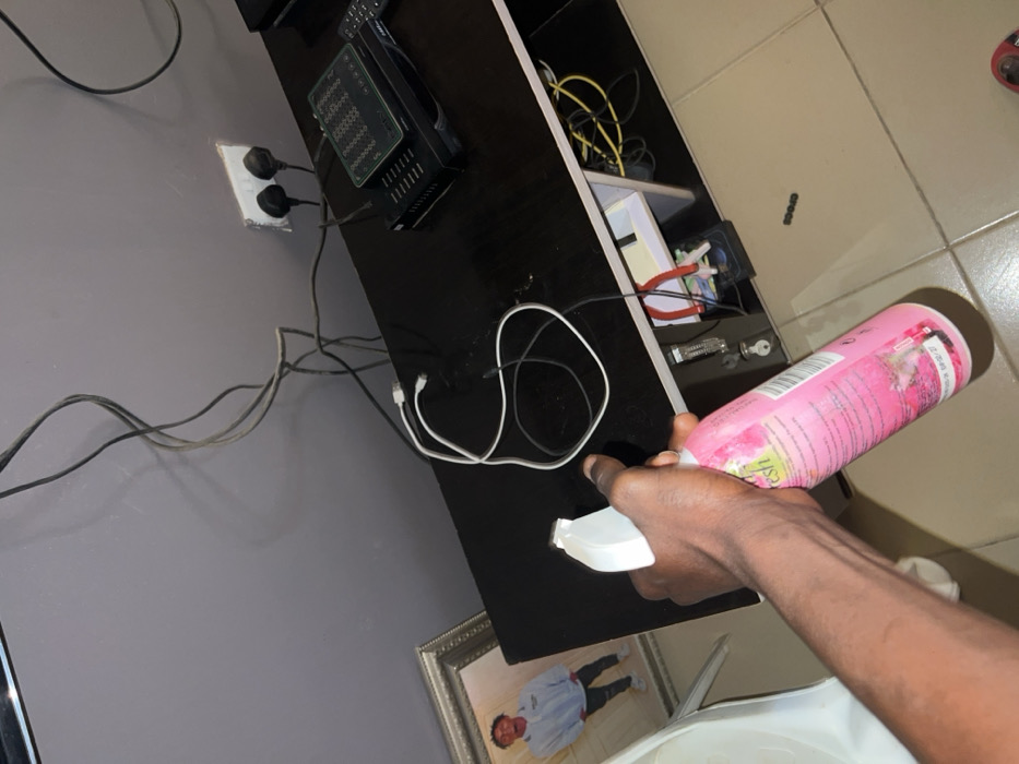 A person's hands hold a pink aerosol spray can with a white nozzle. The can is aimed toward a white toilet, suggesting cleaning. A black shelf unit with exposed wires, a power strip, and tools is visible in the background. The gray wall has a partially visible electrical outlet. A framed picture is near the base of the shelf. Floor tiles are visible in the upper right.