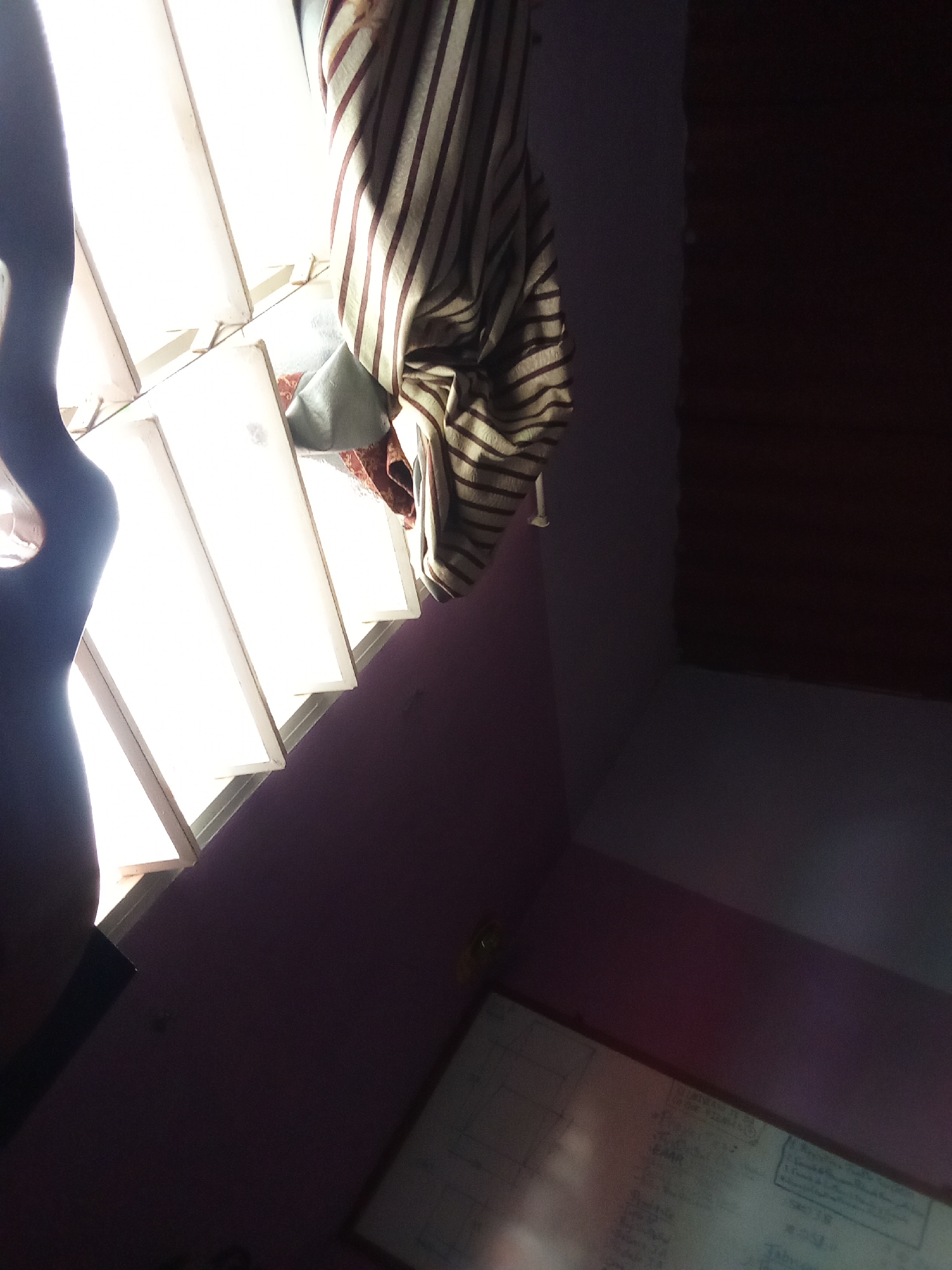 The photo is taken indoors in a room with purple walls. A window with white blinds is on the left of the image, with sunlight streaming in. A striped curtain is draped on the side of the window. A dark shape of a head and shoulder is visible on the left, partially silhouetted against the bright window. In the lower right corner of the image, there is a whiteboard with visible text. The location is in Tinaquillo, Venezuela.